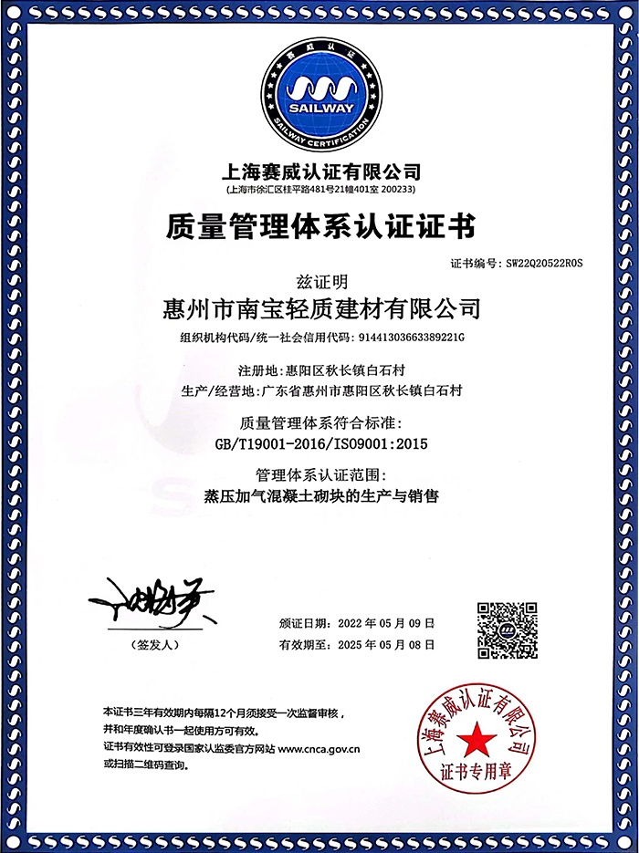 廣東省惠州市南寶輕質(zhì)建材有限公司成立于2007年,公司一直致力于新型環(huán)保的墻體材料的開發(fā)、生產(chǎn)和銷售服務,生產(chǎn)的蒸壓加氣混凝土砌塊遍布惠州、深圳及周邊城市,以高品質(zhì)、高性價比的產(chǎn)品和優(yōu)良的服務質(zhì)量榮獲良好的行業(yè)口碑,公司于2020年再接再勵,投入3000余萬資金引進行業(yè)領先的6米全自動加氣混凝土砌塊生產(chǎn)線,具備年產(chǎn)量40萬方加氣混凝土砌塊的產(chǎn)能,同時使產(chǎn)品品質(zhì)、性能更加優(yōu)越。
